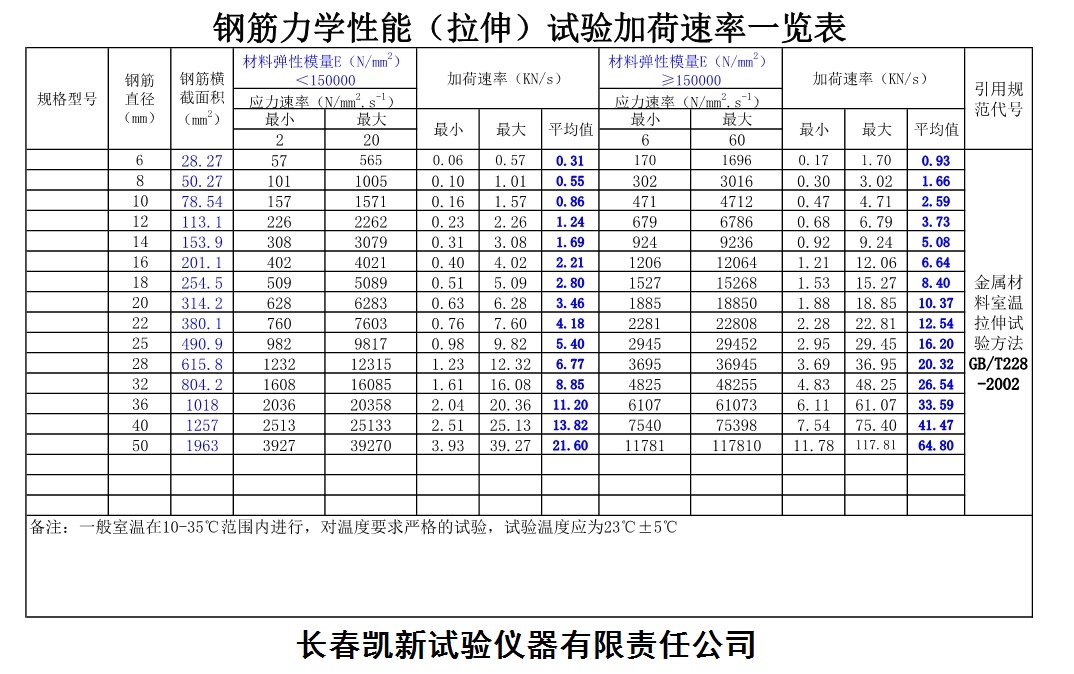 鋼筋力學(xué)性性能試驗加荷速率一覽表